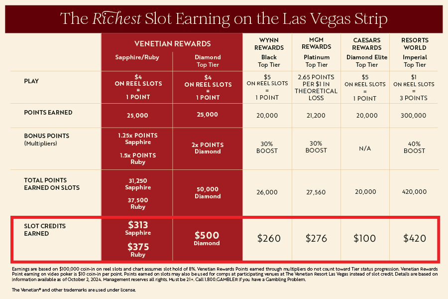 Finally, Venetian Rewards maintains our sparkling reputation as the most rewarding slot rewards program on the Strip.